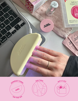 Med i sættet får du den helt nye Demi LED-lampe (9 watt), der sikrer en elegant finish hver gang. Lampen er designet til at gøre påføringen endnu nemmere – den er flad, og låget kan vippes op, så du let kan få begge hænder under lyset, når neglelimen skal hærdes.