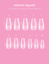 Le Gel Nail Tips findes i flere forskellige former og længder, så du kan skabe netop det udtryk, der passer dig bedst. Medium Square har ikke en mat og for-bufferet overflade. Det anbefales derfor at give tipperne en let buff for at fjerne glans og skabe en ru overflade, der sikrer bedre vedhæftning. Afslut med at tørre overfladen af med vores Nail Cleanser Pads. Dette giver bedre holdbarhed til både gel-lak og almindelig lufttørrende neglelak.