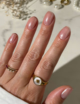 1. Påfør et lag af en valgfri Le Mini Macaron single gel polish, som skal bruges som din grundfarve og hærd. Giv den endnu et lag gellak, så farven er helt dækkende på neglene. Hærd den gerne kun halvdelen af den sædvanlige tid (ca. 15 sekunder), så den efterlader gellakken en smule klistret. Dette er for at krompulveret vil hæfte bedre til gellakken.