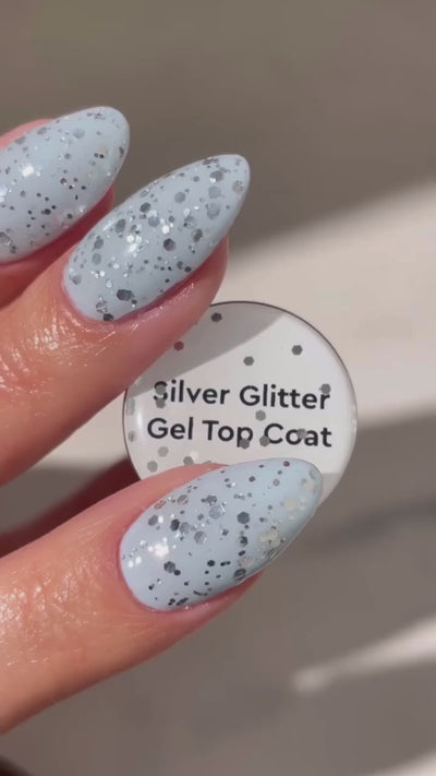 Silver Glitter Top Coat: En klar gel topcoat fyldt med sølvglitter i både små og store stykker - perfekt til at give dine negle ekstra glans og glamour.