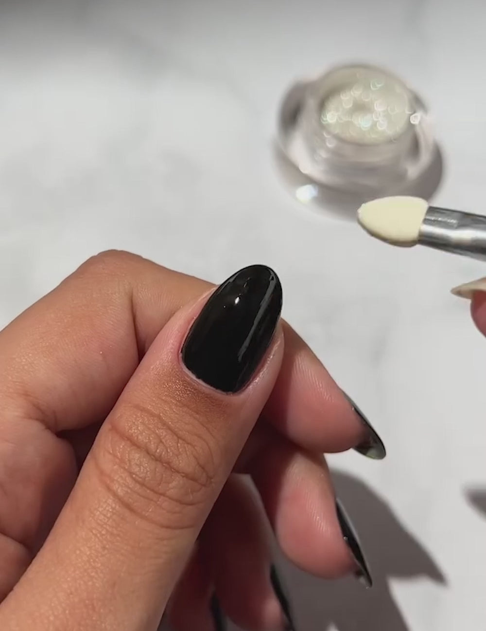 2. Når din gellak er hærdet, er det tid til at påføre Le Métallique. Produktet leveres med en medfølgende pulver applikator, hvor der er en børsten i den anden ende til at fjerne overskydende pulver fra neglene. Dyp forsigtigt pulver applikatoren i Le Métallique-pulveret og poler pulveret på dine negle. Fjern overskydende pulver med børsten.