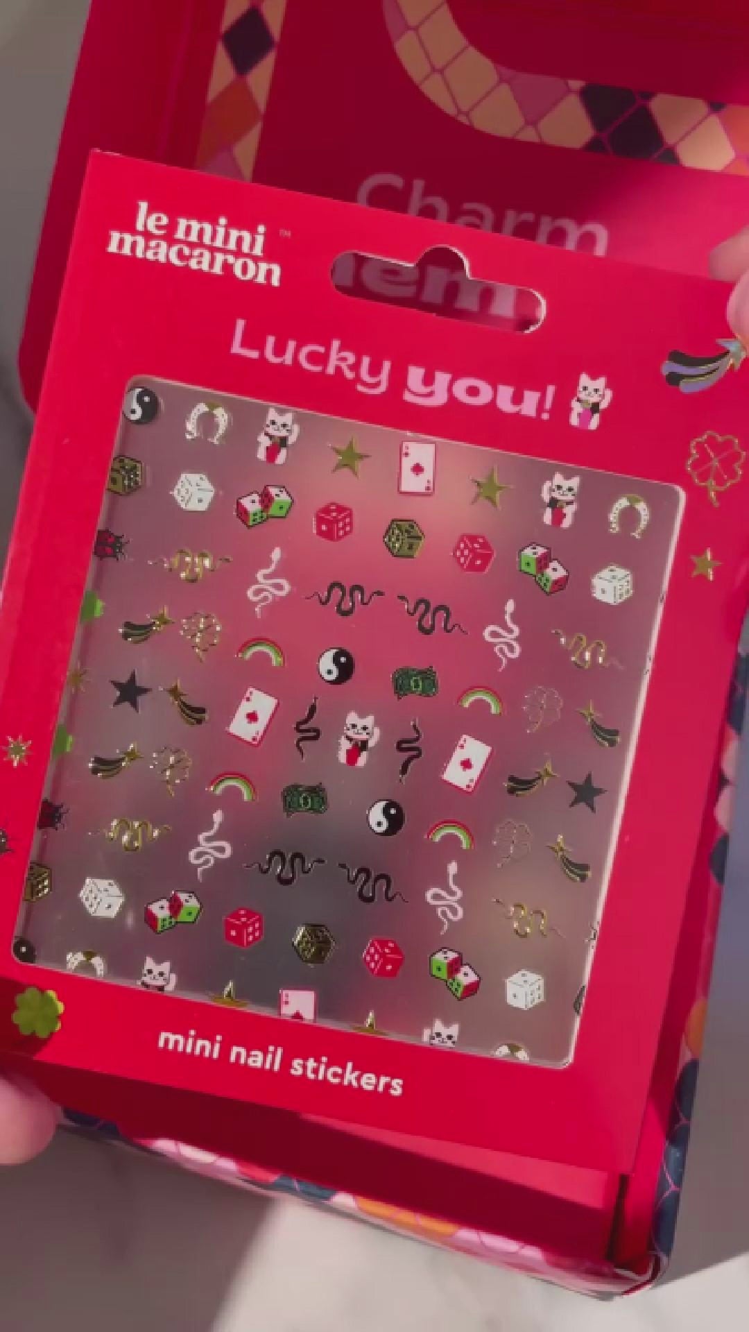 Et sjovt og farverigt ark med negleklistermærker fyldt med symboler for held og positiv energi. Fra yin/yang og terninger til regnbuer og vinkekatte – hvert design tilføjer et unikt og legende touch til dine negle. Perfekt til at skabe et personligt udtryk med et strejf af held.